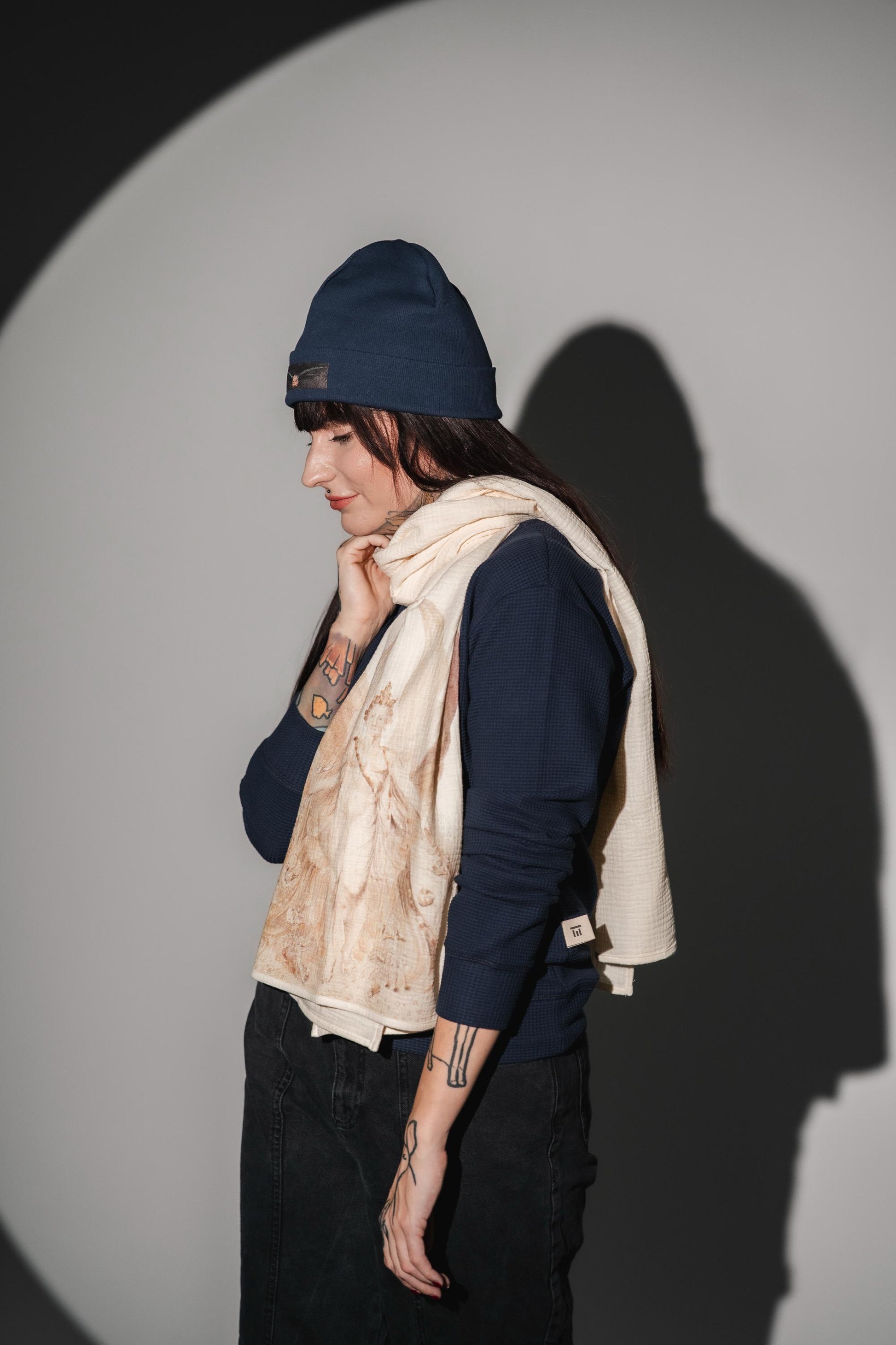 Large double gauze scarf made from natural, unbleached organic cotton with the same texture on both sides, featuring a large hand screen print and a woven logo label.
